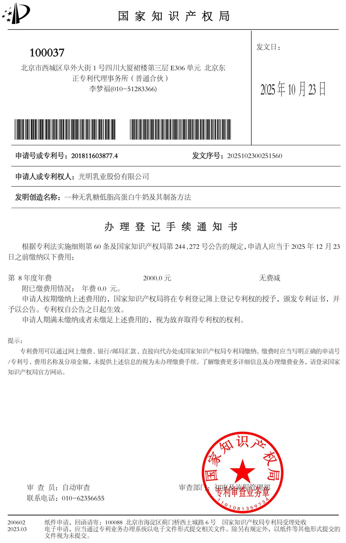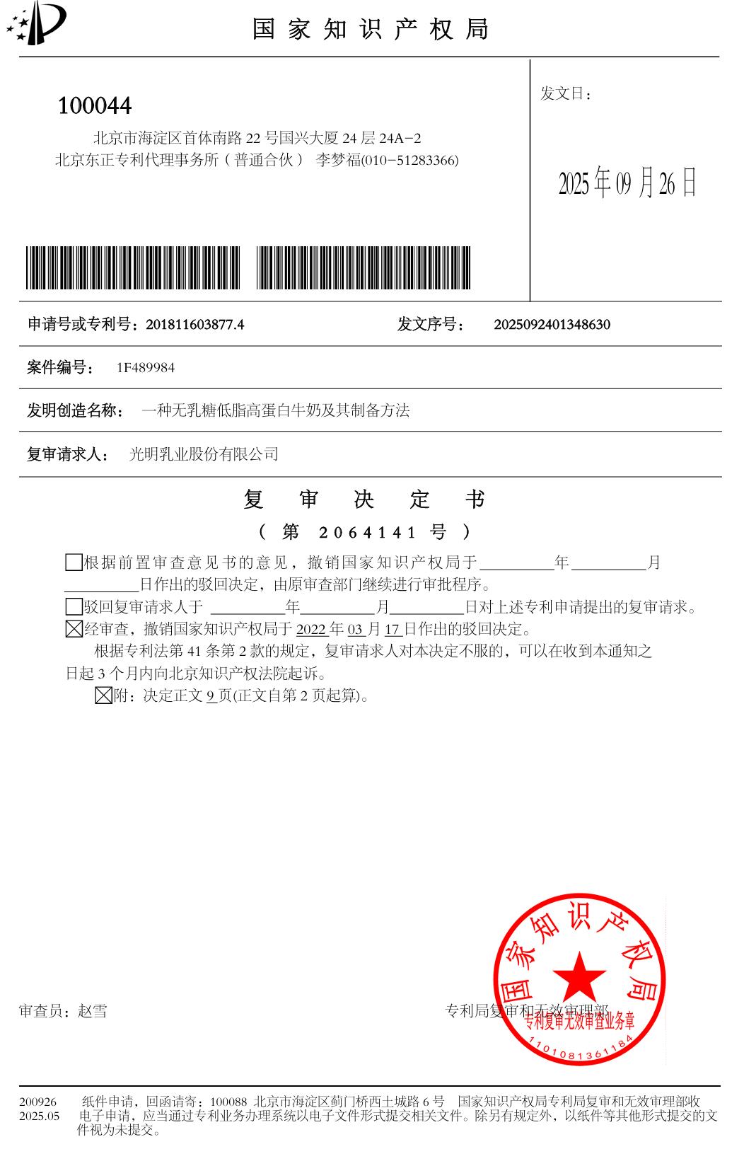 近日,北京东正收到国家知识产权局针对专利号为:201811603877.4,名称为:一种无乳糖低脂高蛋白牛奶及其制备方法发明专利授权通知。该发明技术方案由北京东正专利代理事务所接受光明乳业股份有限公司委托并于2018年12月26日向国家知识产权局提出专利申请。在审查过程中,东正代理人与审查员就该技术方案的创新点经过多次沟通解释,但审查员仍坚持作出驳回决定。东正代理人仔细分析审查意见及驳回决定书,认为审查员对该申请的技术方案理解存在偏差,建议申请人提出复审。申请人同意专利代理人意见后继续委托北京东正于2022年06月28日提出复审请求。经复审专利局复审和无效审理部认可了东正专利代理师的意见,并于2025年9月22日作出撤销驳回决定并做出重新审查决定。经过再次审查,该专利申请于2025年10月23日获得授权。该申请经历了驳回、复审、再次审查的过程,在此过程中,代理人始终以维护申请人利益为出发,据理力争终于实现了“受人之托、忠人之事”的承诺。